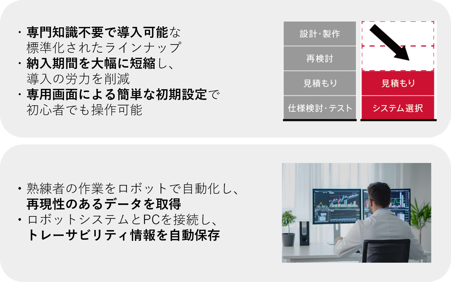 研究室で繰り返し行う液体調合や定容、粉体秤量の作業をそれぞれ自動化する3つの標準システムをパッケージ化。加えて、15種類以上の機能モジュールを組み合わせて柔軟な自動化を実現するCOBOTTA LAB Modulesをラインアップしています。生産性向上や作業負荷軽減に加え、AC100V電源と専用画面による簡単設定で立ち上げ可能。初めてロボット導入をする方にも安心してご使用いただけます。