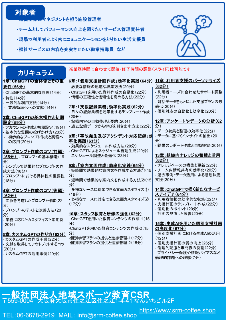 ChatGPTの基礎操作から、業務自動化、データ分析、利用者支援のパーソナライズ、生成AIを活用した個別支援計画の高度化まで体系的に習得可能です。