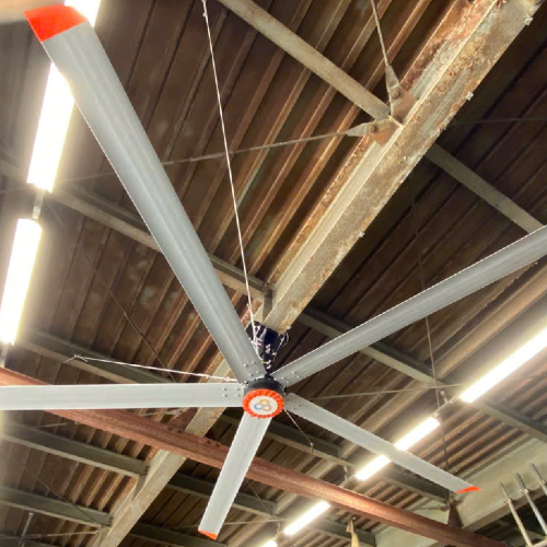 大型シーリングファンは、大空間の空気をゆるやかに循環させ、温度ムラの解消と省エネ効果を実現する送風機です。工場・倉庫・体育館・商業施設などで使用され、少ない電力で広範囲に気流を届けられるため、空調効率が向上し、快適性とコスト削減に貢献します。また、安全性を考慮した設計や静音性に優れており、さまざまな施設に導入可能。長期的な運用コストを抑えながら快適環境の構築をサポートします。