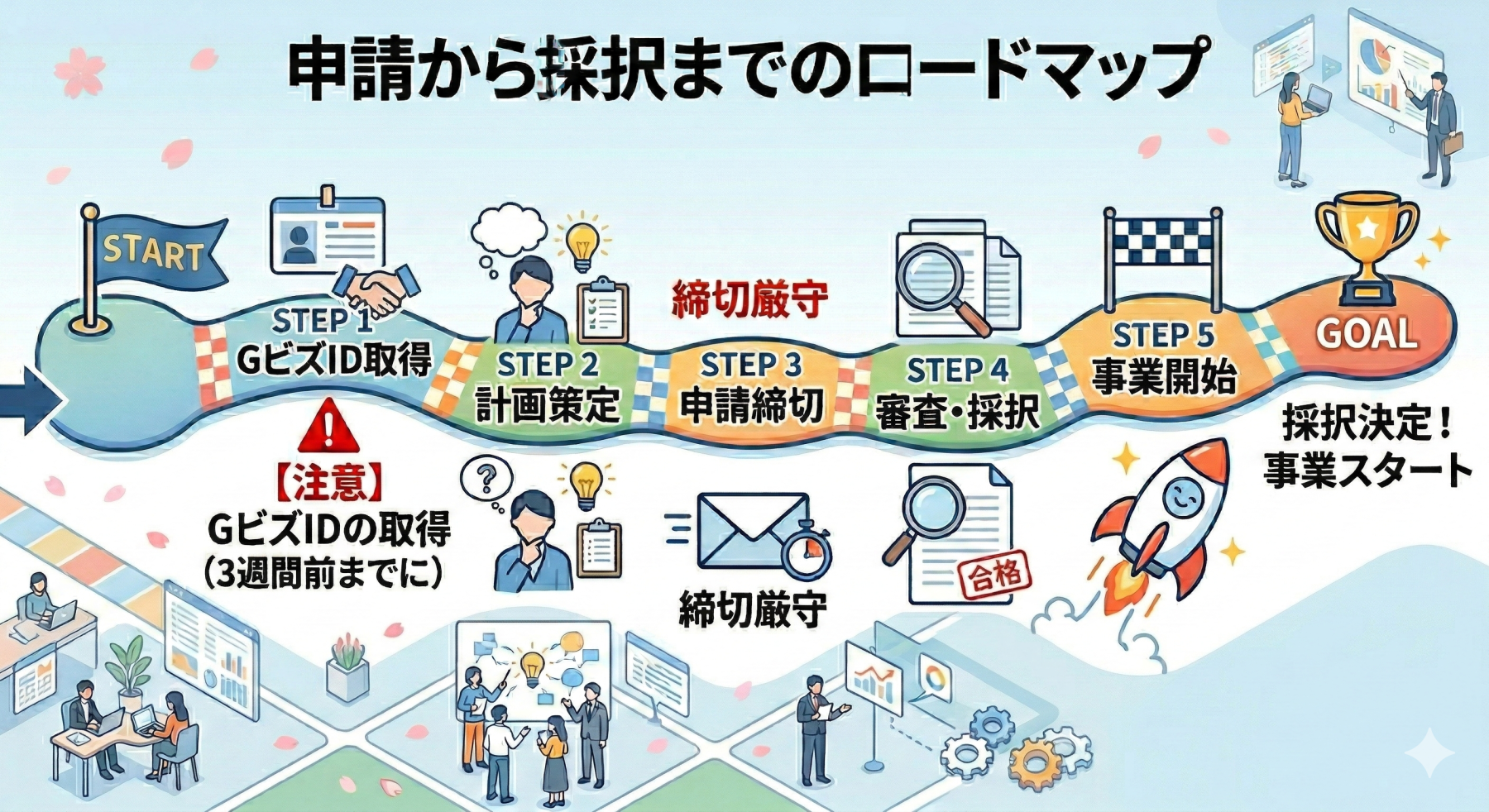 「GビズID」は早めの取得: 全ての電子申請に必須のIDですが、発行に2〜3週間を要します。公募が始まってからでは間に合わないため、余裕をもったスケジュールで取得を強く推奨します。