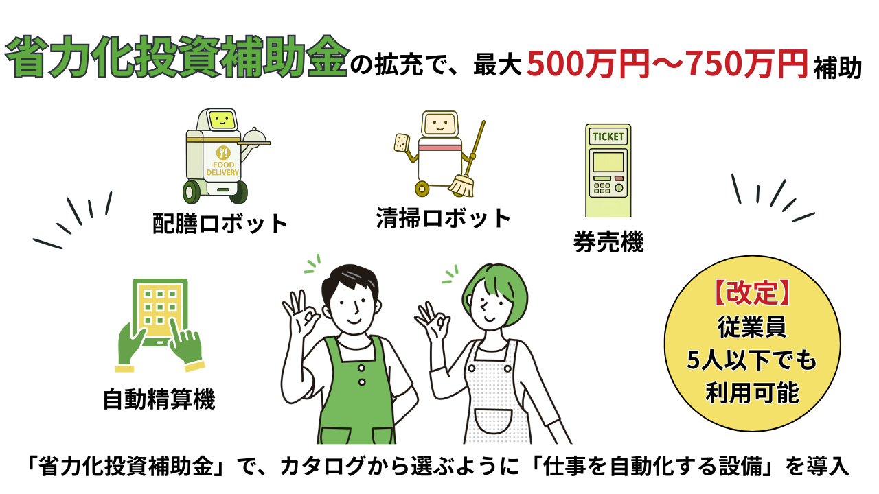 「省力化投資補助金」は3月19日の改定により拡充され、従業員5人以下の小規模事業者でも最大500万円(一定の賃上げ要件を満たす場合は最大750万円)の補助が受けられる枠組みとなりました。