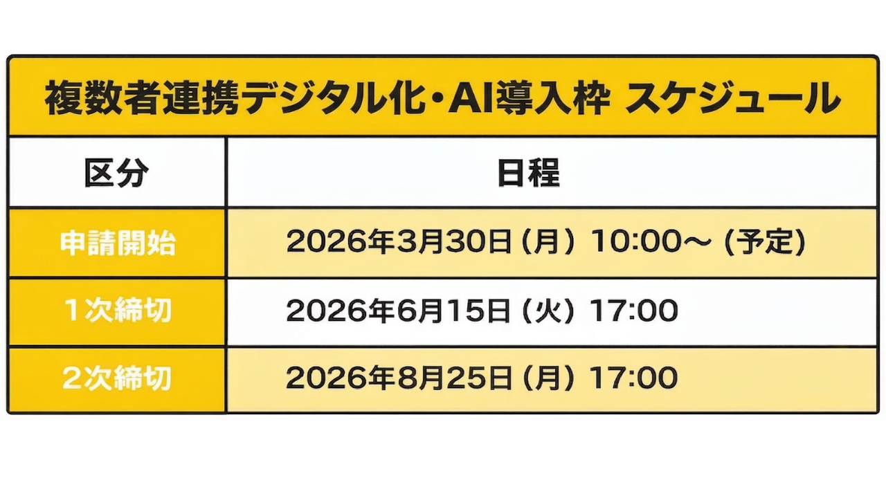 複数者連携デジタル化・AI導入枠は、通常枠やインボイス枠とは異なり、独自のスケジュールで実施されます。