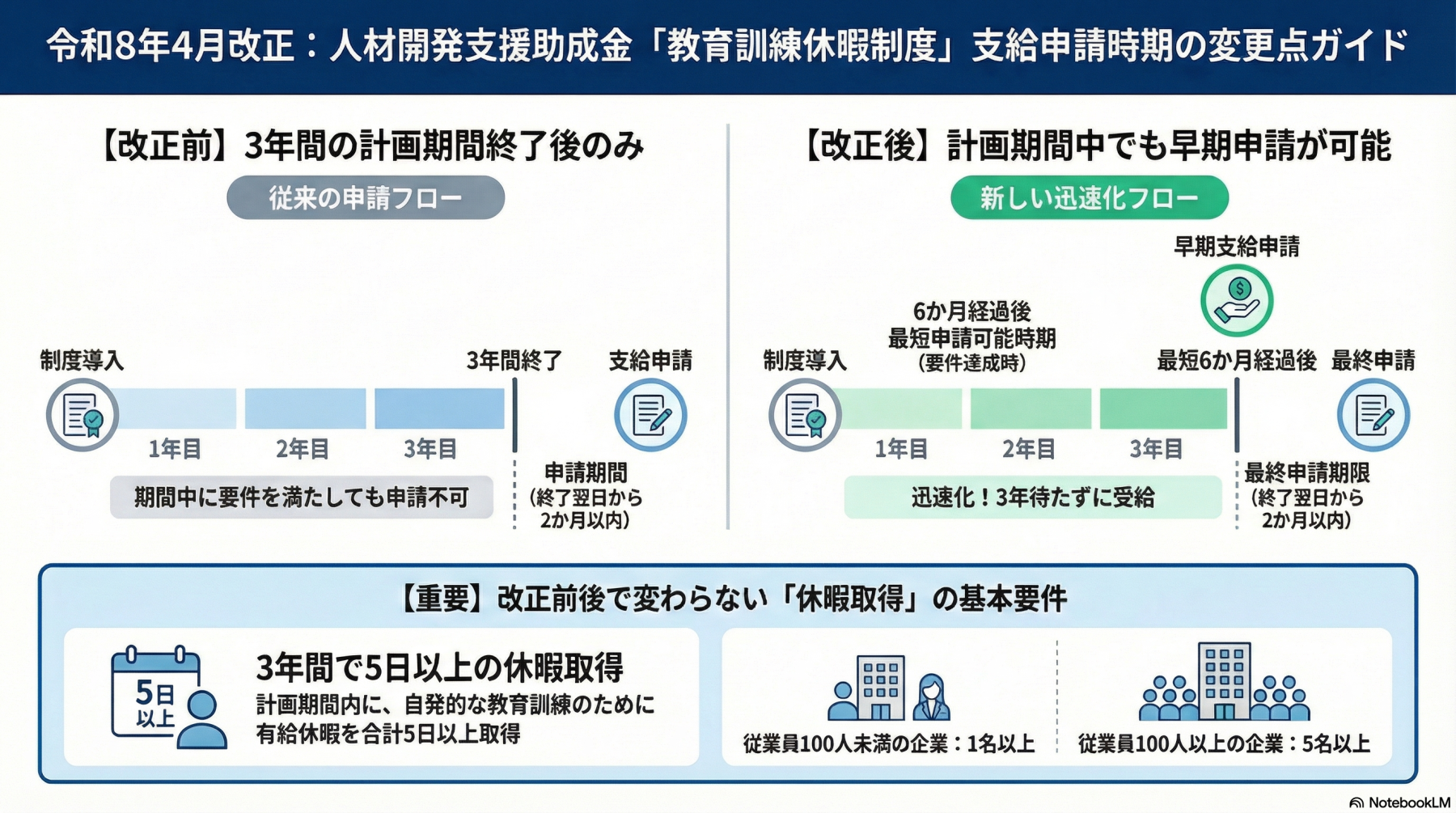 令和8年(2026年)4月の制度改正により、人材開発支援助成金「教育訓練休暇制度(教育訓練休暇等付与コース)」は、支給申請のタイミングが大きく見直されました。