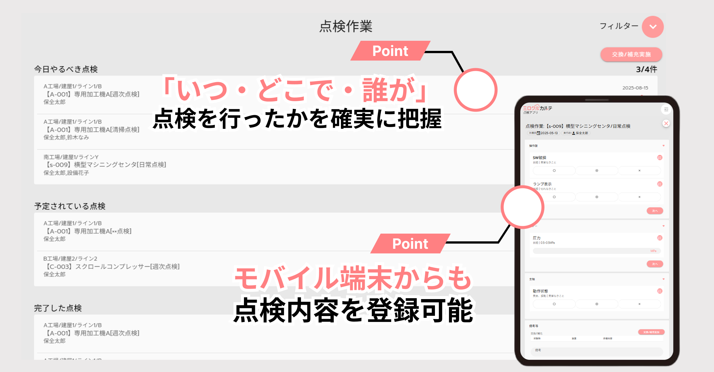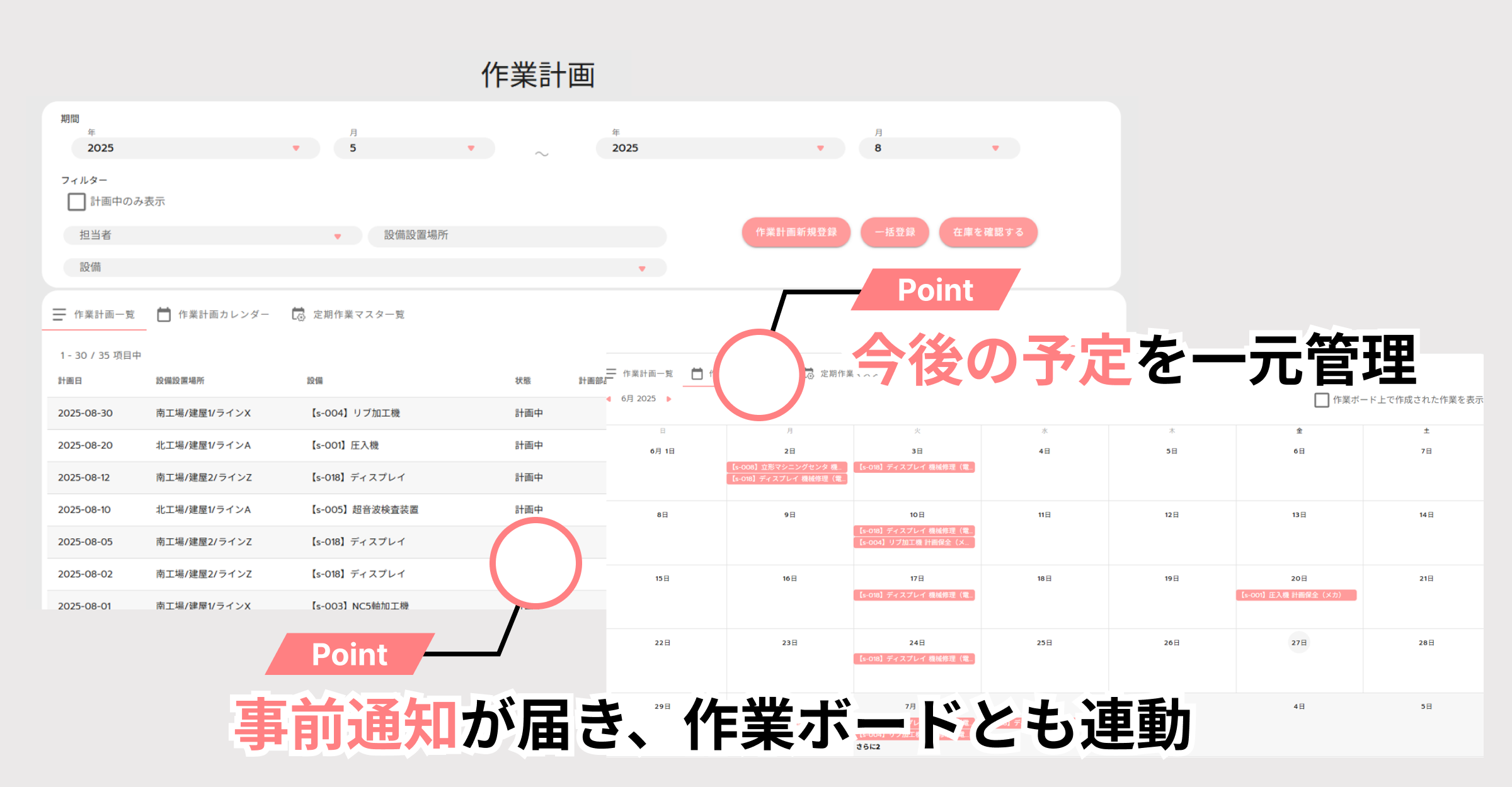 設備保全管理業務において、「どの業務」を「だれが担当」し「どのような状況」にあるかをダッシュボードで可視化し、「誰に確認したらいい」、「いまどうなってる」をなくします。今の業務を効率化するだけでなく「故障を減らし、保全業務を改善する」をご支援し、保全現場の全体最適をお手伝いいたします。
