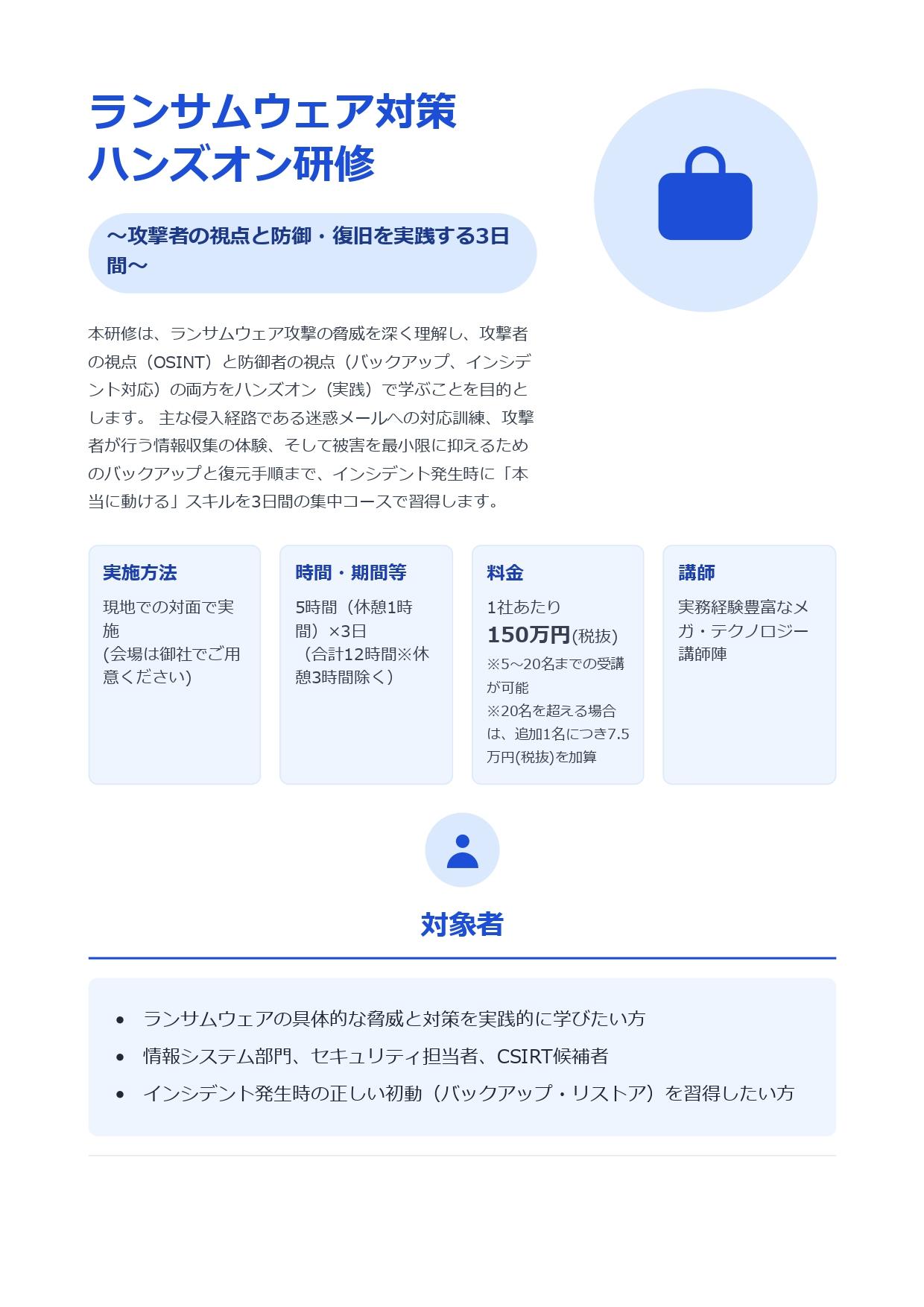 ランサムウェア攻撃への実践的な対応力を身につける3日間の集中研修。攻撃者の視点(OSINT)から防御者の視点(バックアップ、インシデント対応)までを体系的に学び、実際に手を動かしながら「動けるセキュリティ担当者」を育成します。迷惑メールへの初動訓練、情報収集手法の理解、バックアップと復旧手順の演習を通じ、被害を最小限に抑える現場対応力を習得できます。 ■こんな方におすすめです ・ランサムウェアの脅威と対策を体系的に理解したい情報システム部門・セキュリティ担当者 ・CSIRTメンバーや候補者として、初動対応から復旧までの実践スキルを身につけたい方 ・迷惑メール訓練やバックアップ戦略を社内に展開したい担当者 ランサムウェア攻撃の仕組み、侵入経路の分析から復旧手順までを、実務に即した形で習得できる集中研修。攻撃者の手法を理解し、防御と復旧の両面から企業を守る力を養います。 ■導入実績など https://mgt-net.com ■主なカリキュラム ・脅威の理解と侵入経路 ・ランサムウェアの暗号化・二重脅迫の仕組み ・フィッシング・RDP・VPNなど主要な侵入経路の分析 ・攻撃者の視点とOSINT演習 ・Google DorkingやShodanを用いた情報収集 ・SNSや漏洩情報からの調査と防御策立案 ・復旧とインシデント対応 ・バックアップ戦略(3-2-1ルール)の実践 ・感染シミュレーションとデータ復元演習 ・インシデント初動対応のロールプレイング